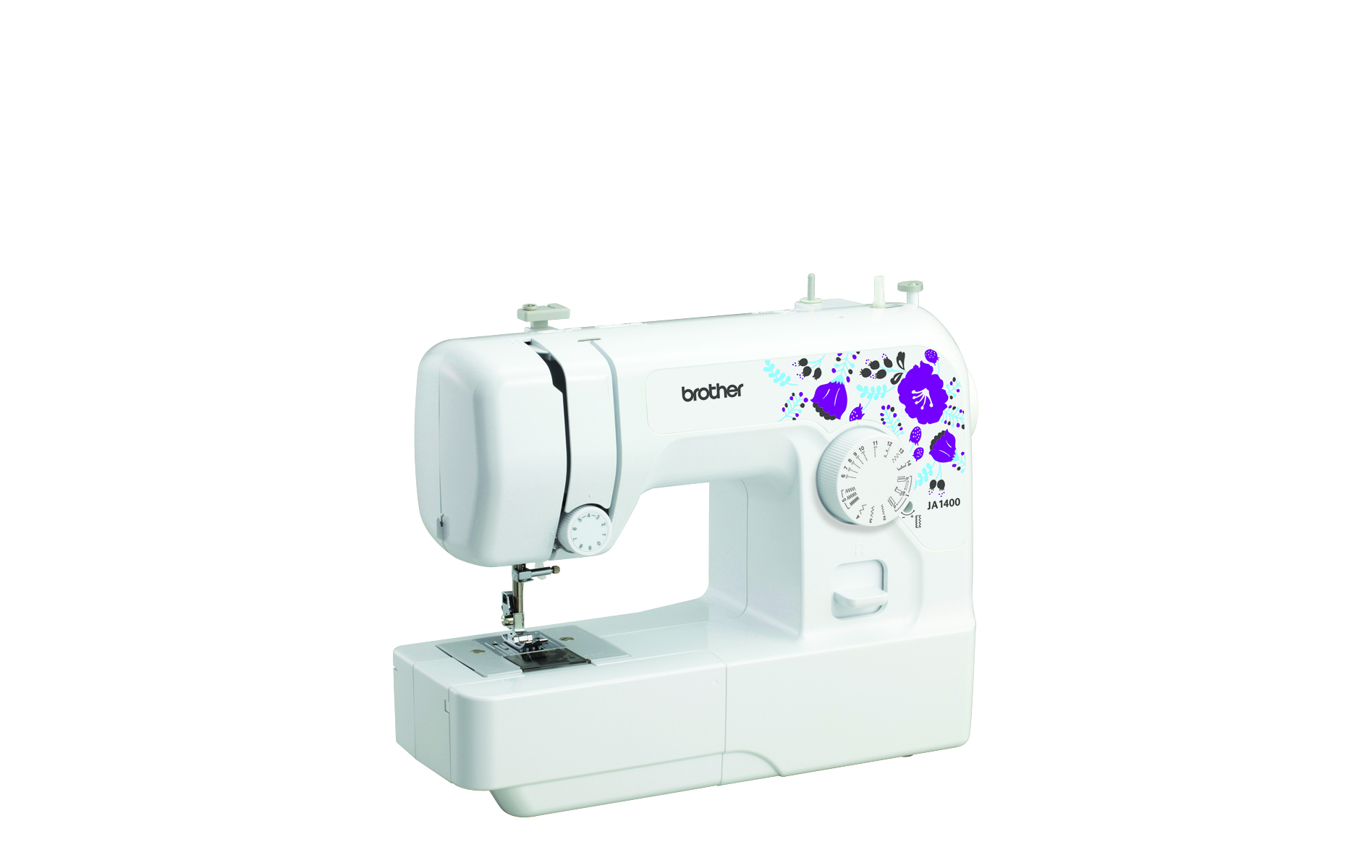 Featuring 14 built-in stitches, 4-step buttonhole and auto set stitch length and width. The free arm sewing surface is easily convertible from traditional flatbed to free arm for sewing cuffs and sleeves. It also features LED lighting for bright and easy sewing, as well as top load bobbin for easy setting, easy maintenance and clear view. The JA1400 comes with a DVD that takes you step-by-step into sewing, and includes all the instructions for two great start sewing projects.