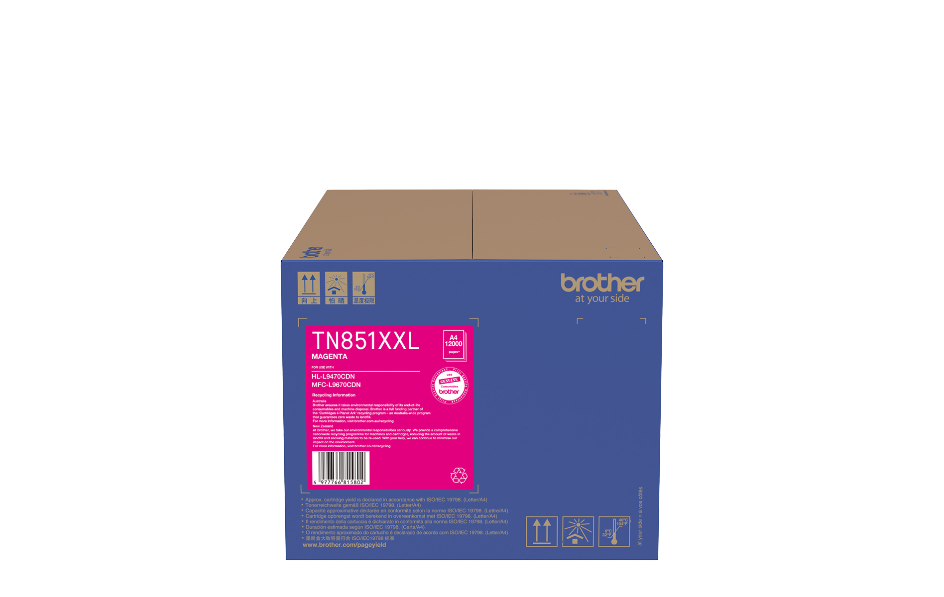 The TN851XXLM magenta super-high capacity toner gives you up to 12,000 pages of printing (approx. yield is declared in accordance with ISO/IEC 19798). Use this Brother genuine super-high capacity toner to receive our unique 4-year on-site warranty and other leading service and support. Every Brother Genuine toner cartridge is produced through a responsible global supply chain that prioritises people as well as performance. Brother works closely with its suppliers to uphold strict health and safety standards, helping to ensure safe working environments throughout the manufacturing process. We are committed to respecting fundamental human rights across our supply chain, including fair labour practices and ethical working conditions. By choosing Brother Genuine consumables, you are not only protecting your printer and print quality, but also supporting responsible production you can trust.