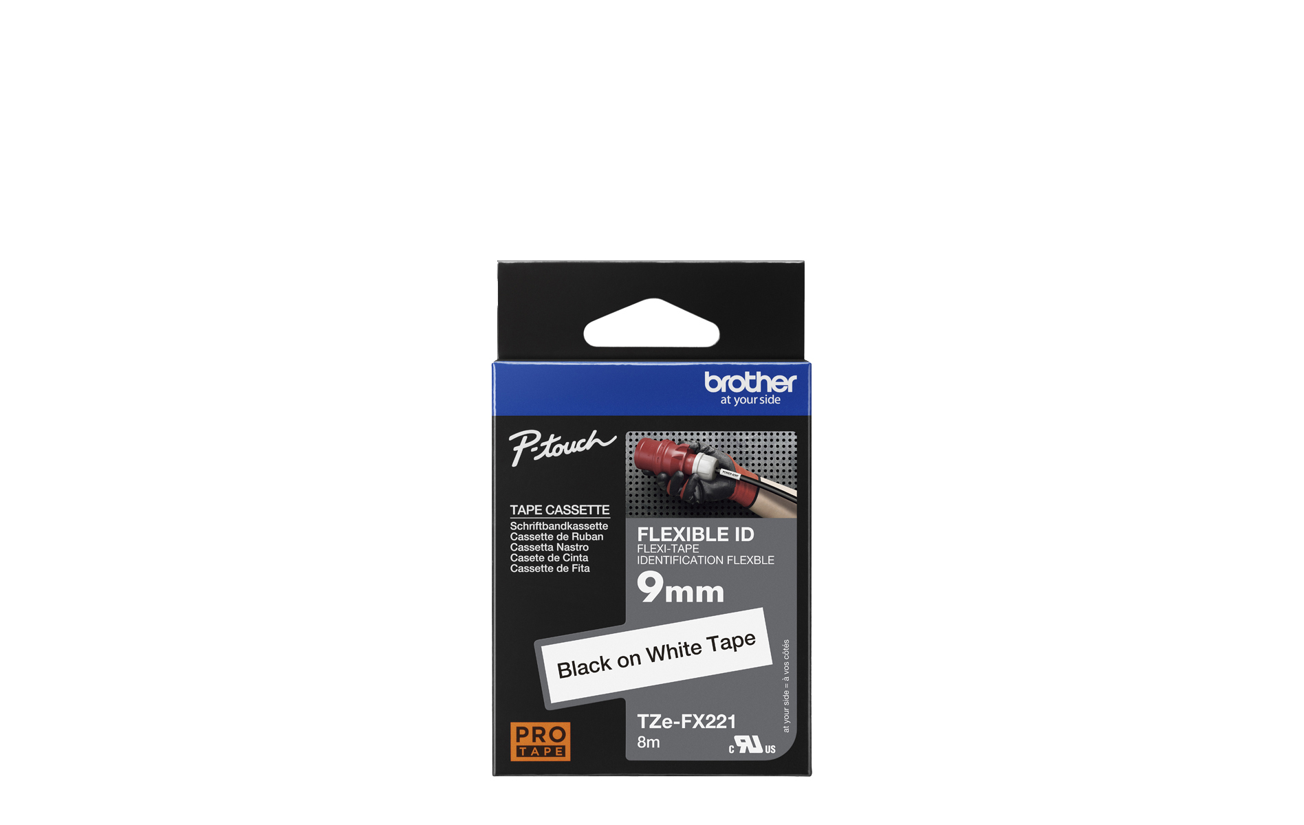 Ideal for producing identification labels for cables, wires, PVC tubing or anything else cylinder-shaped, the special adhesive on the Brother TZe-FX221 black on white labelling tape ensures that your important labels stay put for longer. Compatible with P-touch label printers that show the TZ or TZe logo on the tape cassette cover.