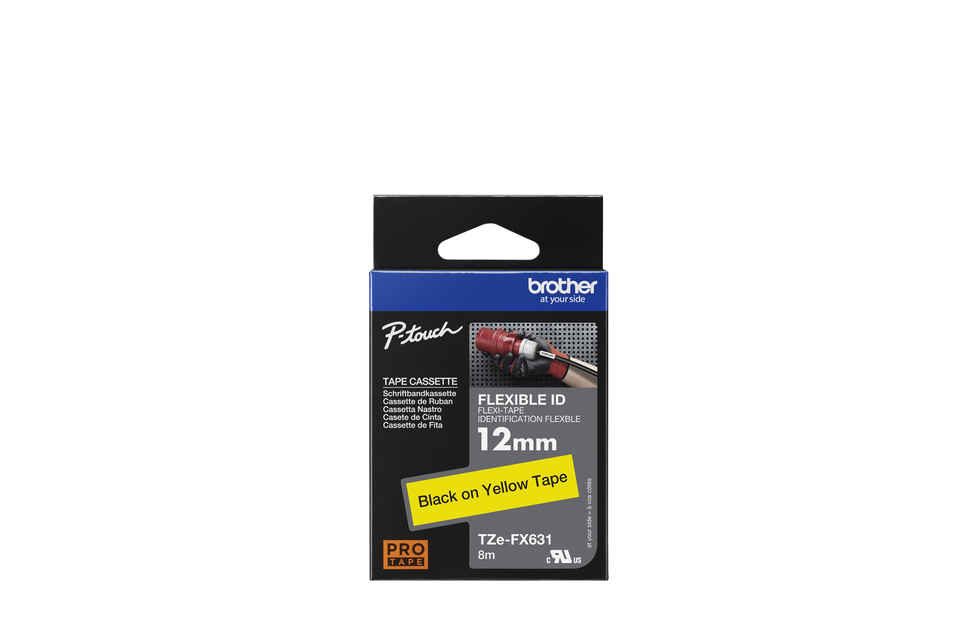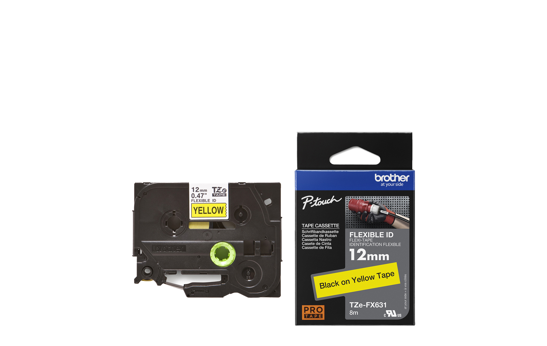 Ideal for producing identification labels for cables, wires, PVC tubing or anything else cylinder-shaped, the special adhesive on the Brother TZe-FX631 black on Yellow labelling tape ensures that your important labels stay put for longer. Compatible with P-touch label printers that show the TZ or TZe logo on the tape cassette cover.