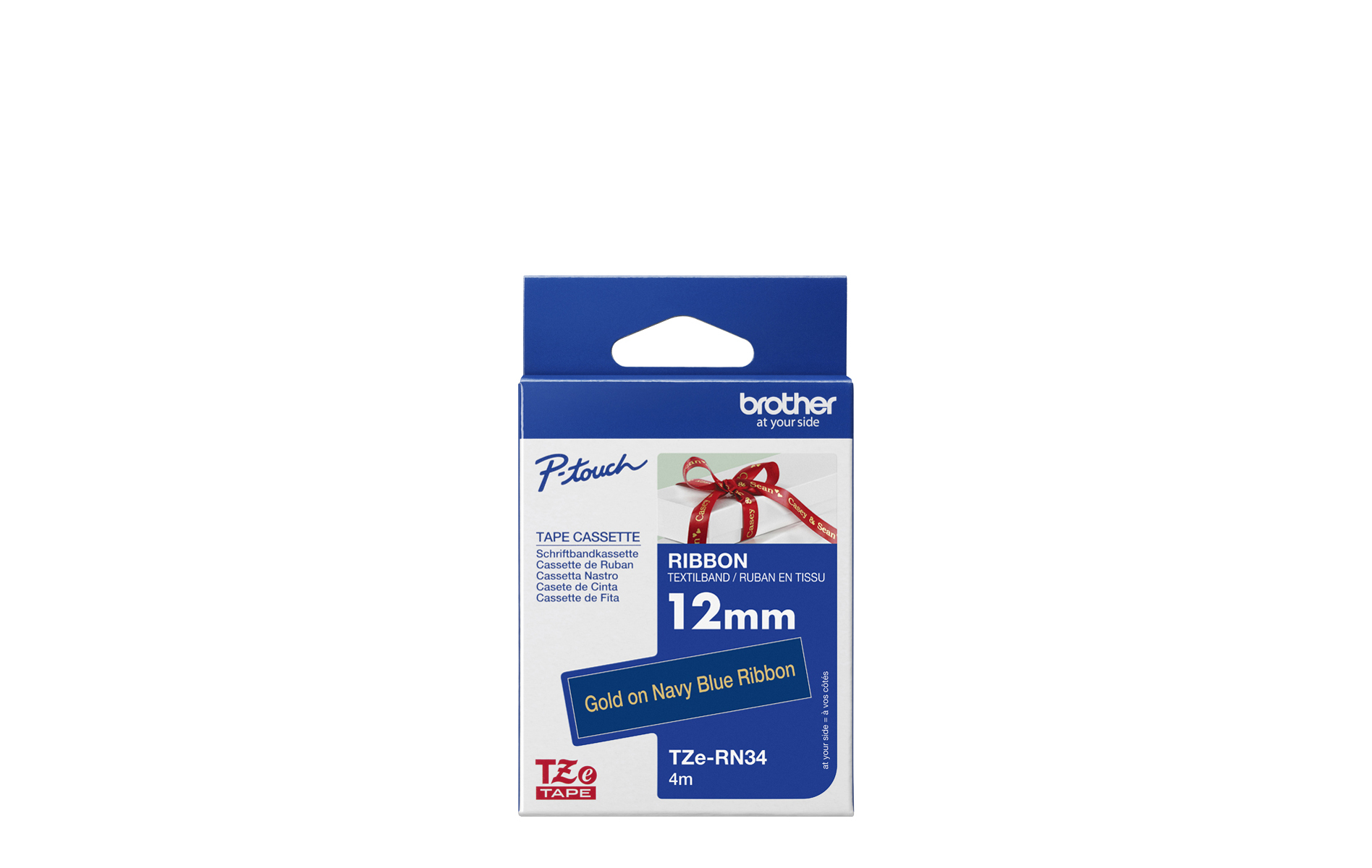 Use the TZe-RN34 together with your P-touch printer to express your best wishes to loved ones on special occasions. Work your magic to add a personalised touch to gifts, cards and crafts, with the genuine Brother TZe-RN34 ribbon tape. With the TZe-RN34 you can enjoy fast and reliable output, as well as a sharp and professional standard of printing. The beautiful Gold on Navy Blue Brother TZe-RN34 labelling tape is guaranteed to provide you with quality fabric ribbon. With a luxury shiny finish this non-adhesive fabric ribbon is perfect for present wrapping and crafting.