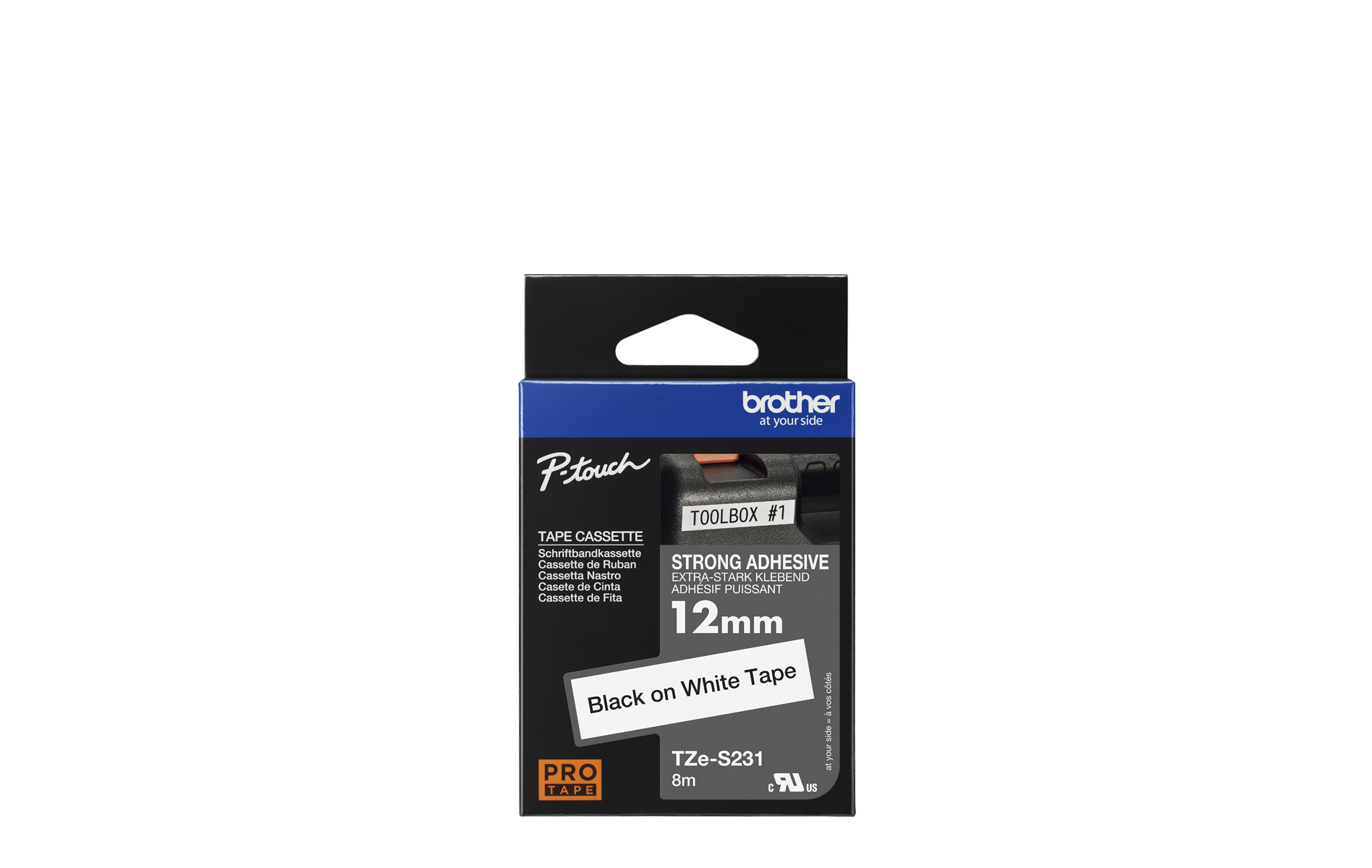 Compatible with a wide range of Brother’s P-touch printers, this genuine laminated TZe-S231 strong-adhesive labelling tape cassette is especially versatile thanks to its easy-to-read black and white colour – so it comes in useful around the home, office and in other workplaces.
